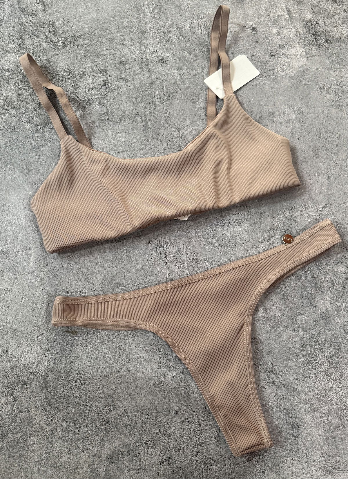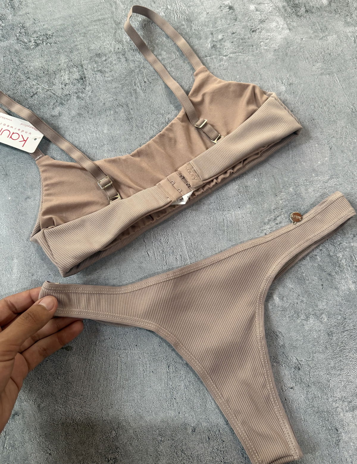 Es un conjunto top corpiño con broche posterior y colaless básica. Morley microfibra la tela.